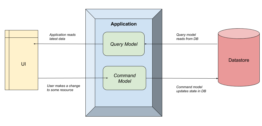 對比一下常用的 CRUD 模式(創建-讀取-更新-刪除),通常我們會讓用户界面與負責所有四種操作的數據存儲交互。而 CQRS 則將這些操作分成兩種模式,一種用於查詢(又稱 "R"),另一種用於命令(又稱 "CUD")。