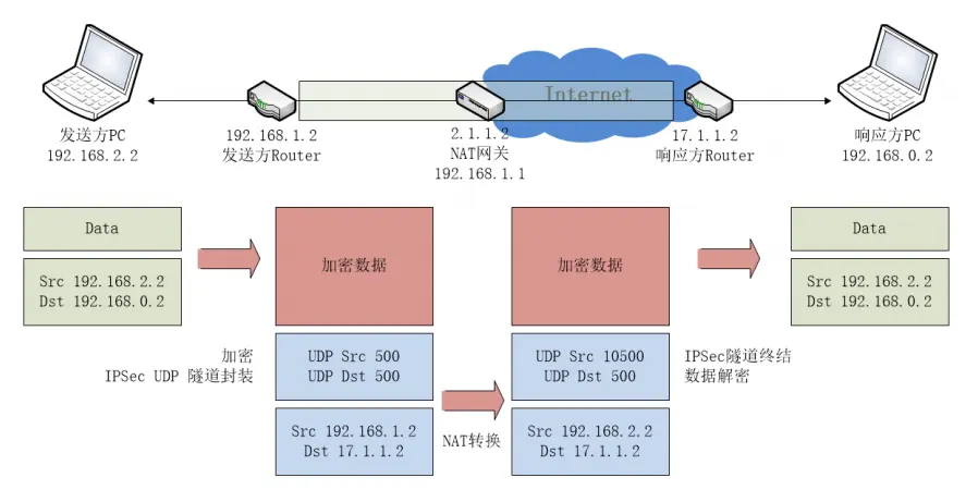 此外,在 NAT 模式下,由於AH會對IP地址也做Hash運算,因此在地址轉換之後 AH 的 Hash 值會被破壞,而ESP的IP協議號是50,在進行NAT轉換時沒有相應的 TCP或UDP端口號的概念。為了使 ESP 能夠滿足 NAT環境下的地址轉換,這時就需要引進一個新的方法,即在ESP報文和 IP 報頭之間加入一個新的UDP報頭。
