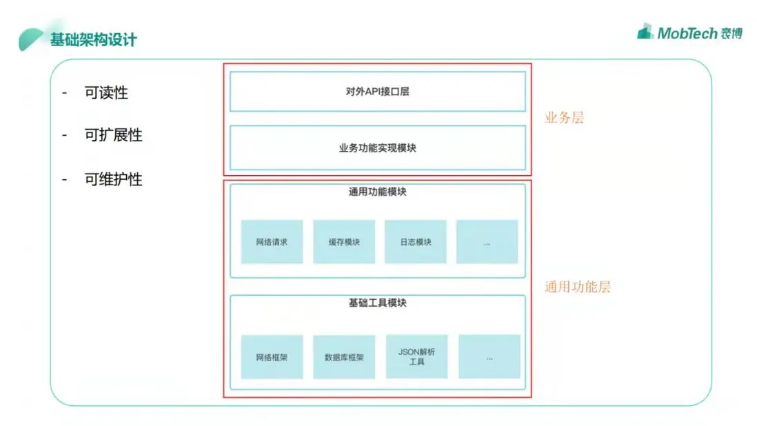 第一步是基礎架構設計,一個好的架構可主要從可讀性、可擴展性、可維護性三個方面進行考慮,即功能模塊間相互獨立,降低耦合度,保證結構清晰易於維護。通常我們可以把SDK架構簡單分為兩個層次:業務層和通用功能層。業務層可以獨立成業務模塊,包括開放API接口和業務功能實現,能用功能層可以分為兩個模塊,包手通用功能模塊和基礎工具模塊。