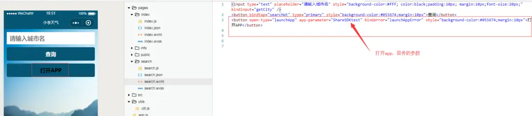 如上所示,配置完回傳的參數,WXEntryActivity.java,在這個類中打開app即可。這樣在小程序中打開app就可以跳轉到app中了,並且可以獲取到回傳的參數。