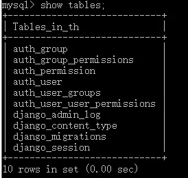 命令執行成功,app1的migrations文件夾中生成0001_initial.py文件,mysql數據庫中添加了10張表。