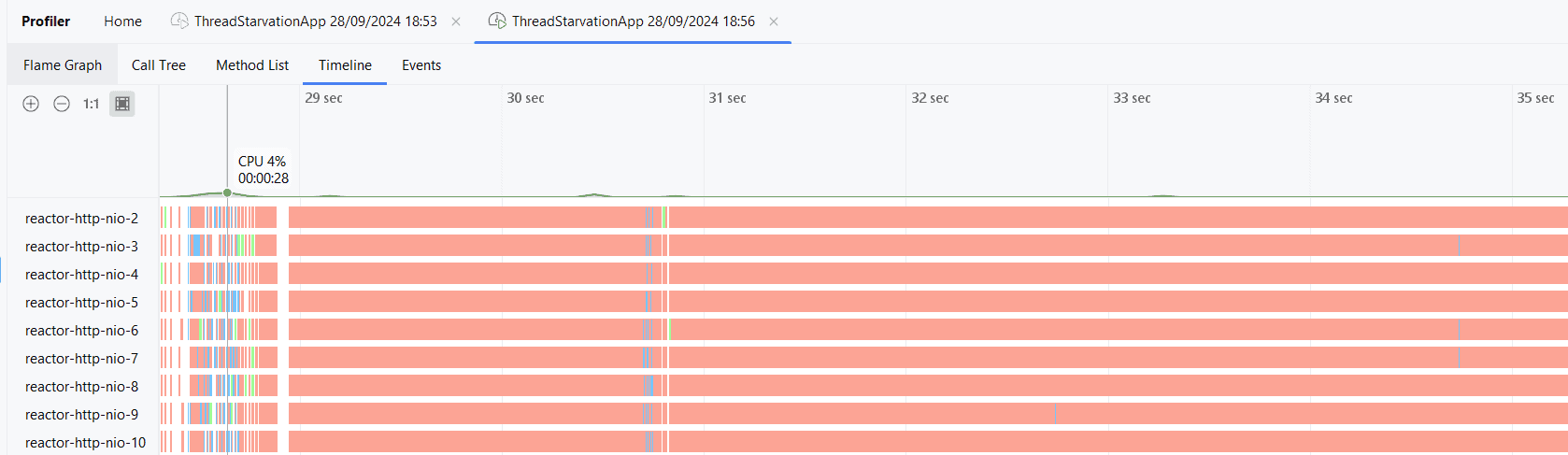 這種延遲是由於Netty HTTP線程池的大小為十二,因此它只能同時處理十二個請求造成的。如果我們在IntelliJ Profiler中檢查,我們可以看到線程大部分時間被阻塞,並且測試過程中CPU使用率非常低:
