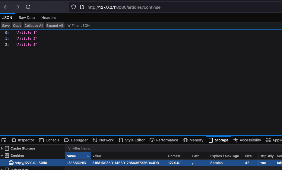 在圖像中,我們可以看到,在成功登錄後,用户可以訪問資源。我們還可以看到添加到瀏覽器的 Cookie。
