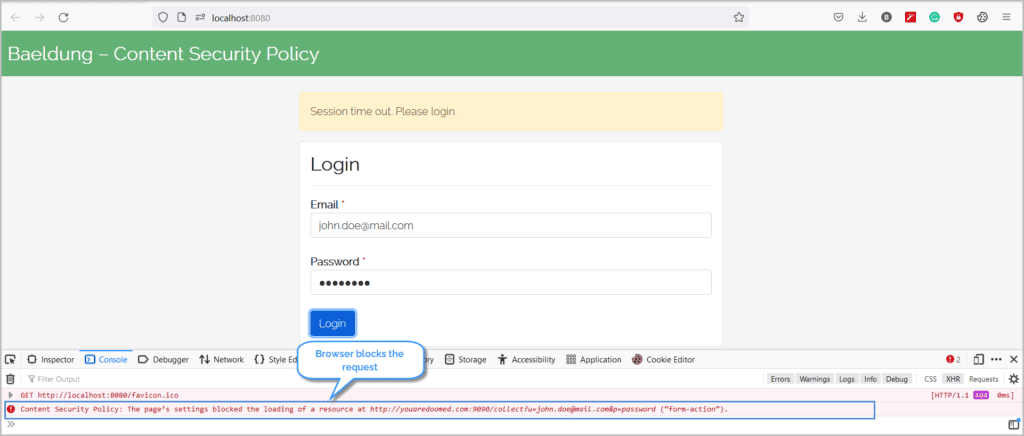 接下來,我們填寫表單並點擊 登錄 按鈕。 就像預期的那樣,瀏覽器會阻止請求併發送報告。 在服務器控制枱中,我們有如下類似的日誌: