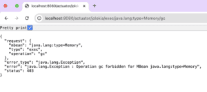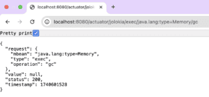 http://localhost:8080/actuator/jolokia/exec/java.lang:type=Memory/gc我們收到一個 200 狀態碼,這意味着垃圾回收命令已被接受。
