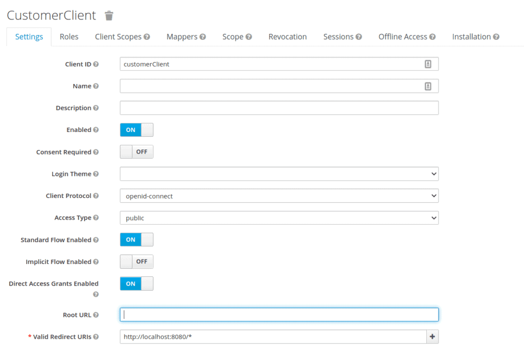 為了簡化操作,我們將 Keycloak 嵌入在 Spring Boot 應用程序中。 假設我們正在使用 在 GitHub 上提供的 授權服務器項目。 首先,我們將在嵌入式 Keycloak 服務器的 customerClient 客户端中定義 realm baeldung: 然後,我們將 realm 詳細信息導出為 customer-realm.json,並將 realm 文件設置為我們的 application-customer.yml: