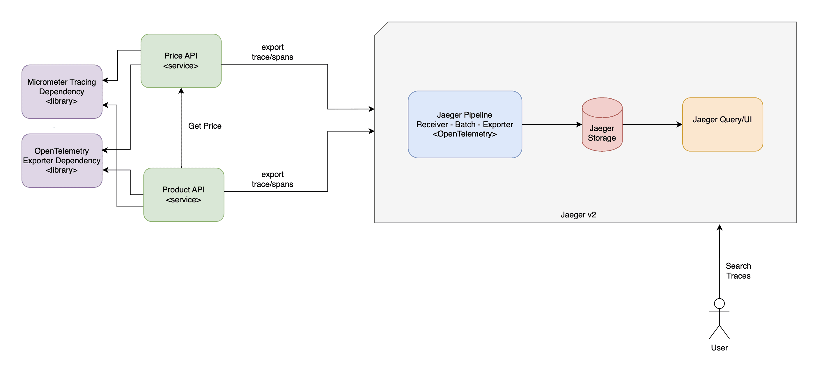 在上述架構圖中,我們實現了向 Jaeger v2 服務導出 span 的 API 服務。 Jaeger v2 服務內部包含三個主要組件,即 collector/receiver、存儲和 UI 服務。