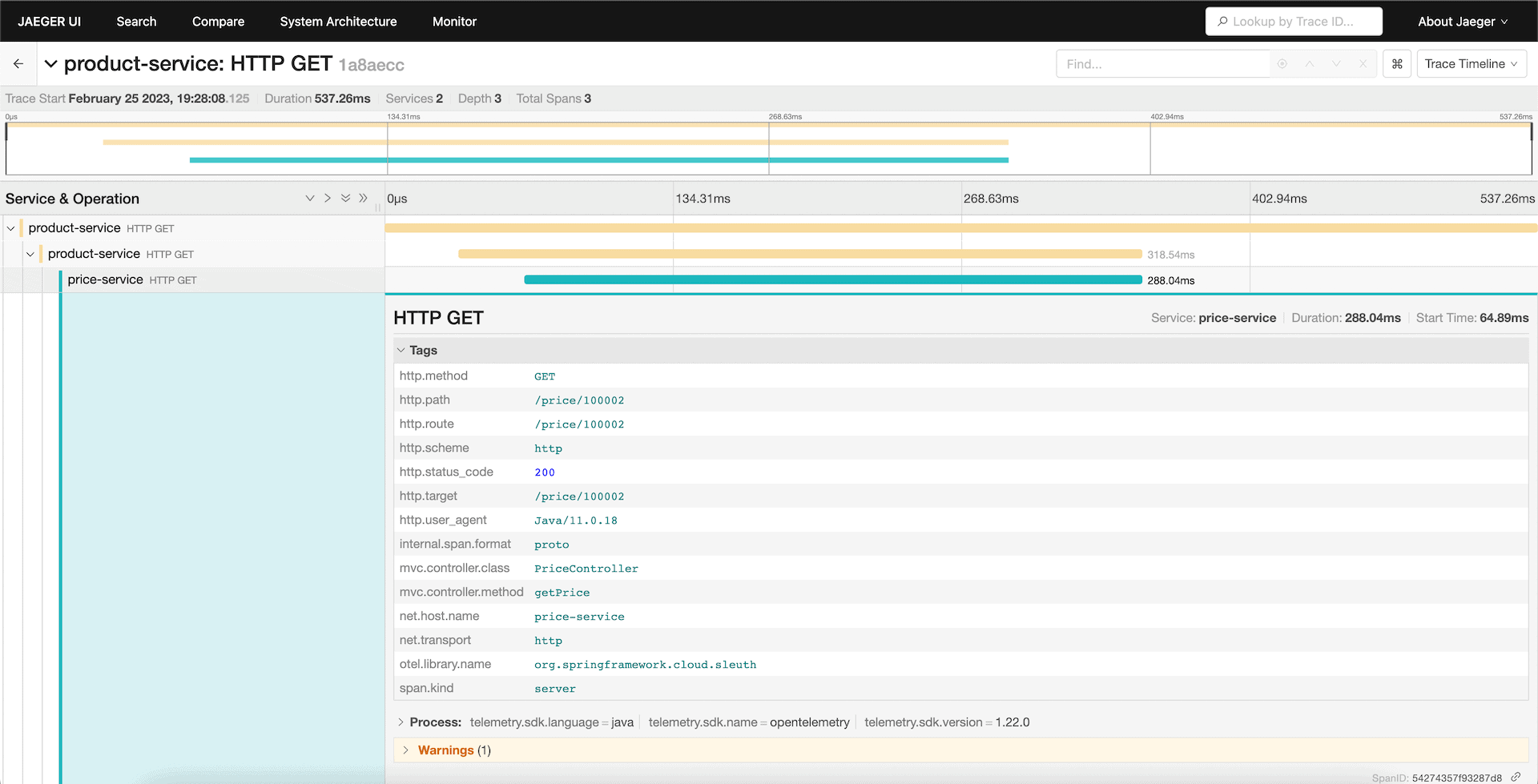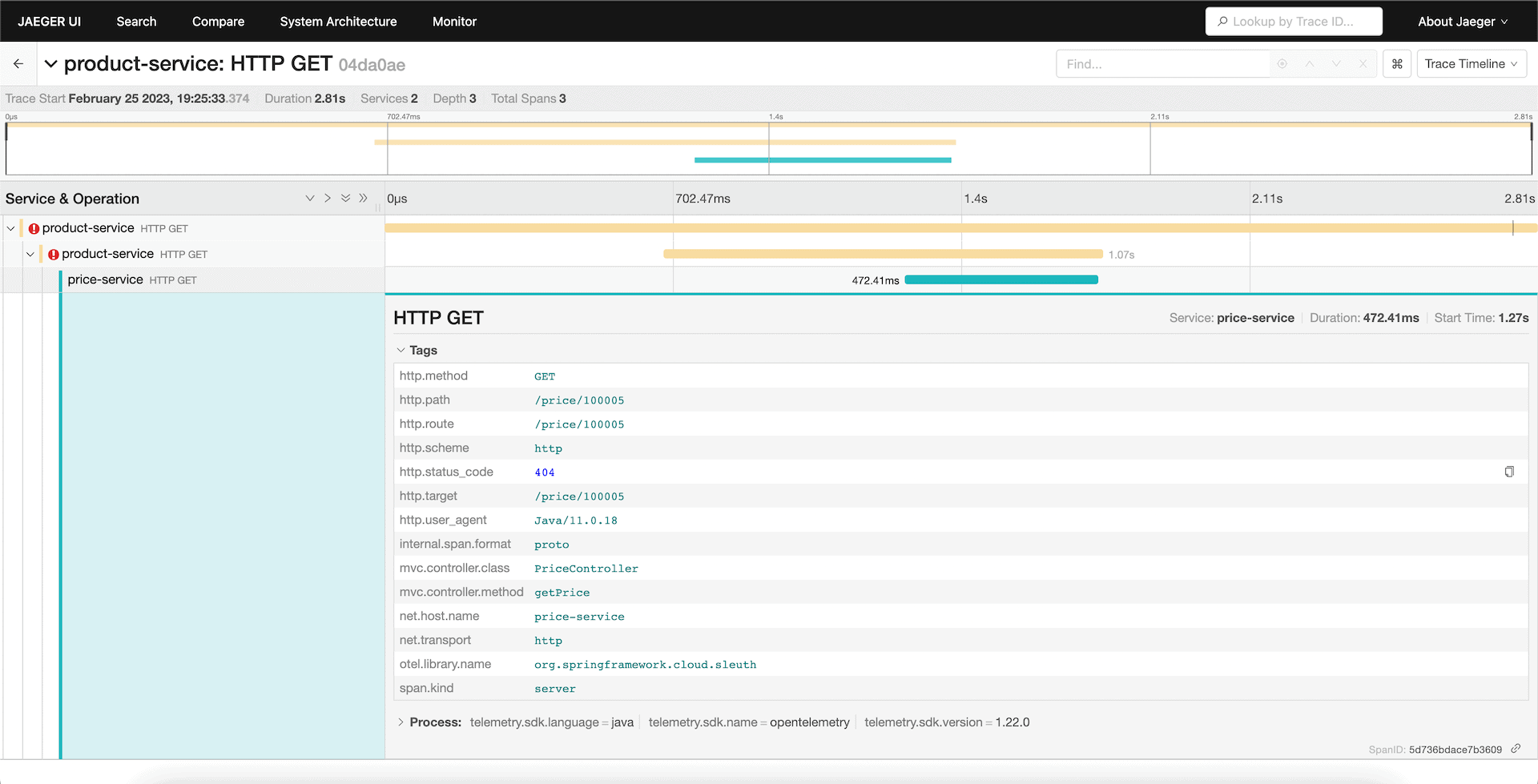 上述 product-service 和 price-service 使用 HTTP 端口 4318 將跟蹤數據發送到 Jaeger 收集器。