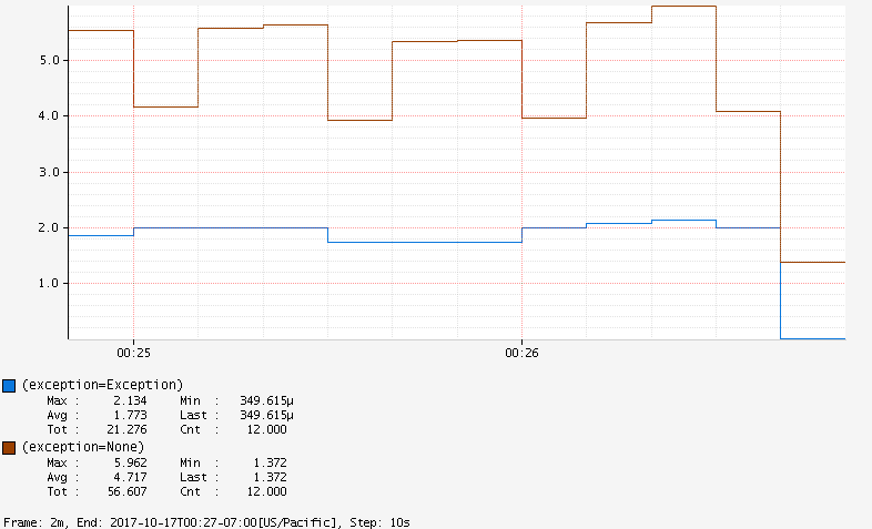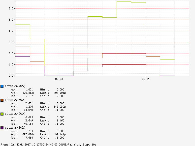 通常,直方圖可以幫助直觀地比較不同分組的數據。此外,直方圖還可以進行時間縮放,這對於分析後端服務響應時間非常有用: