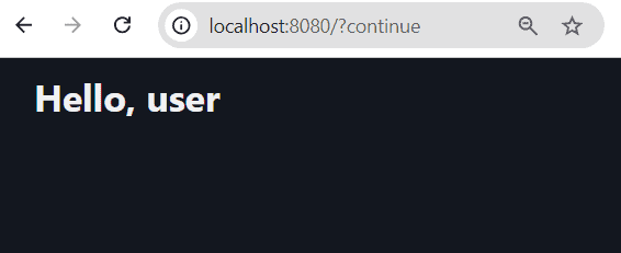 c.b.s.ott.service.FakeOttSenderService : Sending token to username 'user'. token=a0e3af73-0366-4e26-b68e-0fdeb23b9bb2, expiresAt=...要完成登錄過程,只需將令牌值複製並粘貼到表單中,然後點擊 登錄 按鈕。 這樣,您將看到一個歡迎頁面,其中顯示當前用户名: