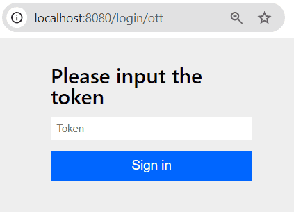 }請注意,“/login/ott” 構造函數參數已傳遞給 RedirectOneTimeTokenGenerationSuccessHandler 。這對應於令牌提交表單的默認位置,並且可以使用 OTT DSL 配置為不同的位置。