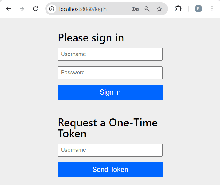 讓我們使用簡單的導航測試來檢查我們的應用程序與 OTT 機制的行為。 通過 IDE 或使用 mvn spring-boot:run 啓動後,請使用您選擇的瀏覽器,並導航到 http://localhost:8080。應用程序將返回一個包含標準用户名/密碼錶單和 OTT 表單的登錄頁面: