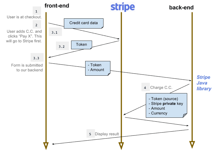 信用卡收費將分為五個簡單的步驟,涉及前端(在瀏覽器中運行)、後端(我們的 Spring Boot 應用程序)和 Stripe。