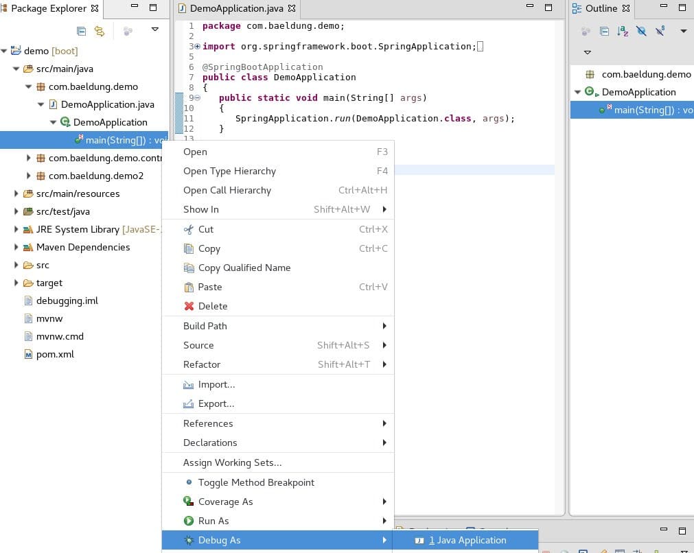 使用 Eclipse 調試 Spring Boot 應用程序最快的方法是右鍵單擊主方法,從 Package Explorer 或 Outline 窗口中: