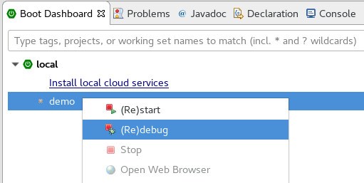 該插件還提供了一個 Spring Boot 運行/調試配置,允許我們自定義單個 Spring Boot 應用程序的調試。 此自定義視圖可在與標準 Java Application 配置相同的地點訪問。