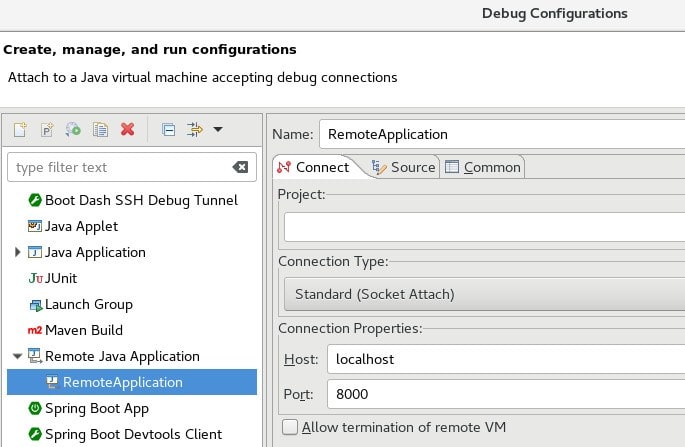 要調試正在運行的進程(無論本地還是遠程主機),我們可以使用 Remote Java Application 配置: