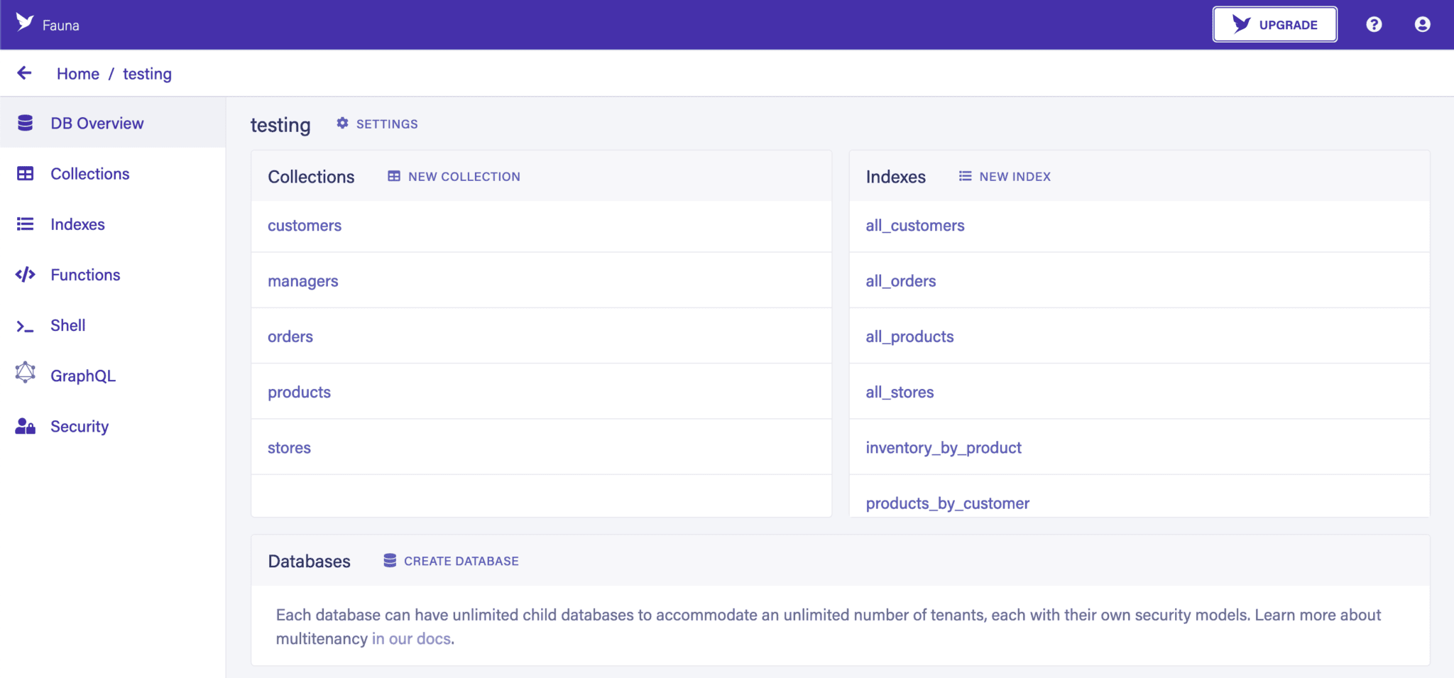 完成這些步驟後,我們就可以使用一個完整的數據庫。如果選擇了演示數據,它將包含一些填充的集合、索引、自定義函數和 GraphQL 模式。如果沒有,數據庫將完全為空,隨時準備好我們創建所需的結構: