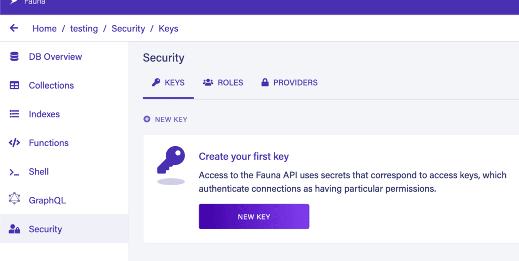 最後,為了從外部連接到數據庫,我們需要一個身份驗證密鑰。我們可以從側邊欄的“安全”選項卡中創建它: