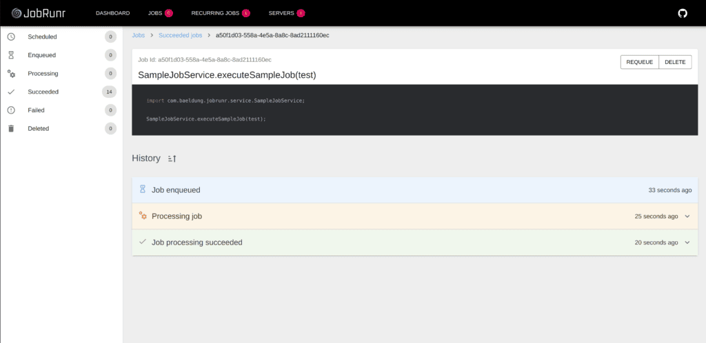 它還包含一個帶有指數退避策略的自動重試功能,用於處理失敗的任務。此外,JobRunr 還內置了一個儀表盤,允許我們監控所有任務。JobRunr 具有自我維護功能——成功完成的任務將在可配置的時間後自動刪除,因此無需手動執行存儲清理。