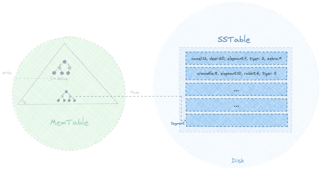 作為一種內存中的可變數據結構,MemTable 使所有寫入操作具有順序性,並允許進行快速寫入操作。 此外,由於物理內存的典型限制,如有限容量和易變性,我們需要將 MemTable 中的數據持久化到磁盤: