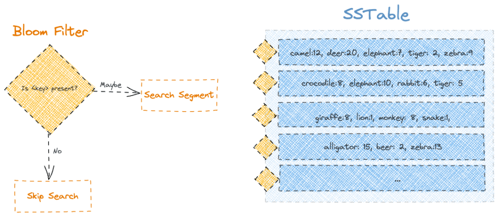 因此,通過為每個 SSTable 的片段附加 Bloom 過濾器,我們可以獲得顯著的讀取查詢優化,尤其是在片段中不存在的鍵時: