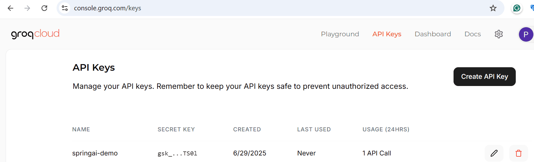 最後,我們必須在 Groq 雲 上註冊並創建 API 密鑰,用於在 Spring AI 配置中使用。