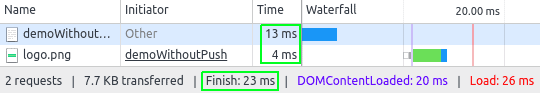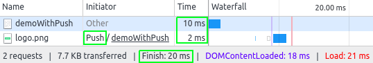 當我們調用 demoWithPush 方法時,我們可以看到推送服務器的使用以及資源如何在服務器端提前交付,從而降低了頁面加載時間: