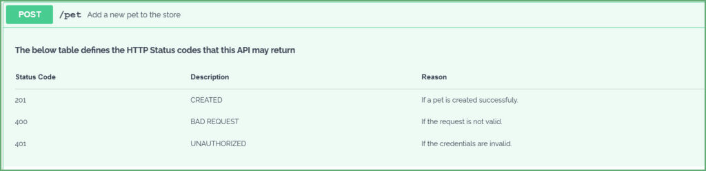 | 201 | CREATED | If a pet is created successfuly. |