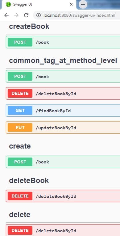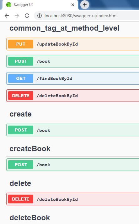 在優先顯示的全局標籤之後,它按路徑字母順序對標籤進行排序。 因此,它首先列出與 /book 路徑關聯的操作的標籤,然後是與 /deleteBookById 路徑關聯的操作的標籤: