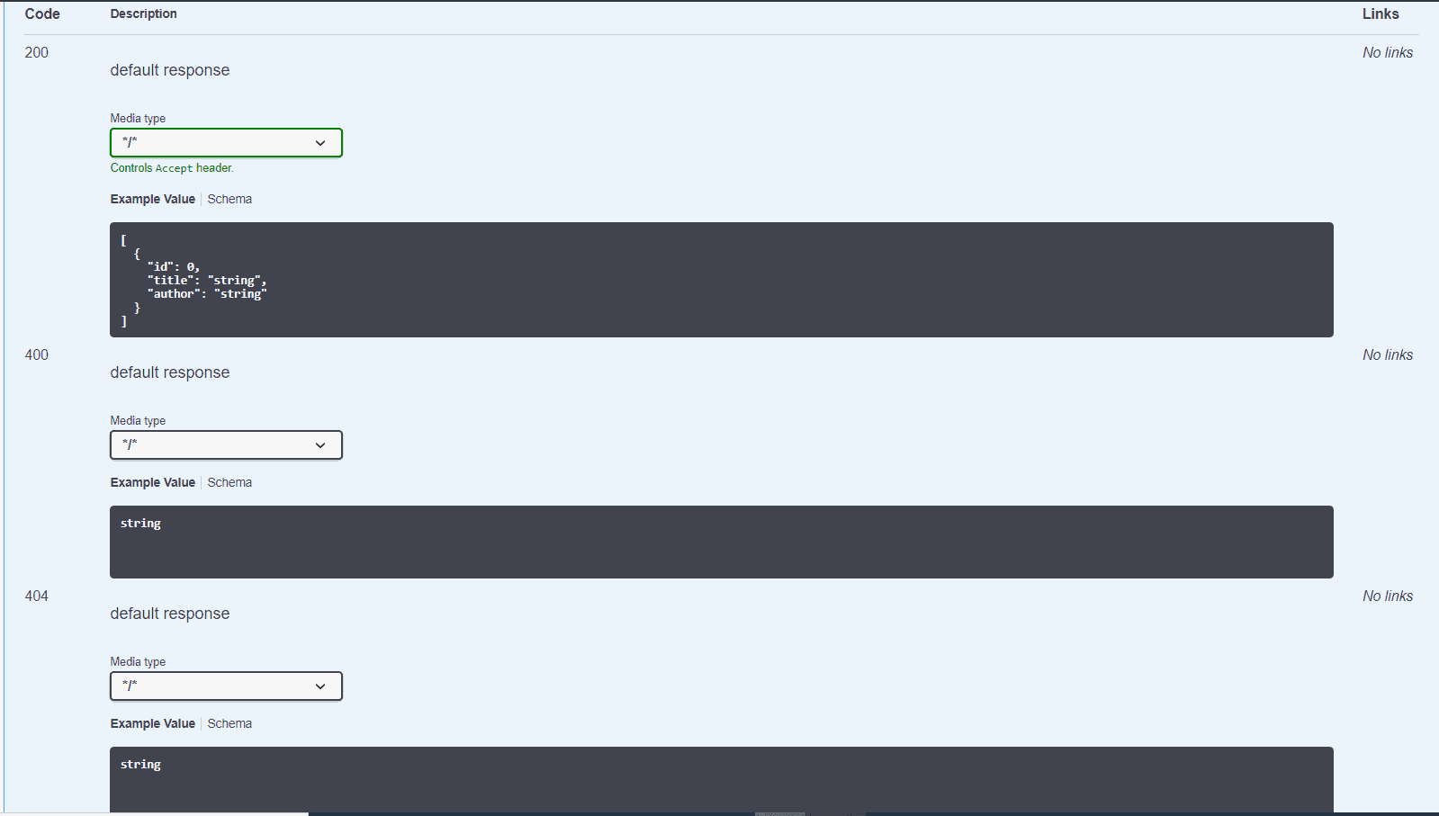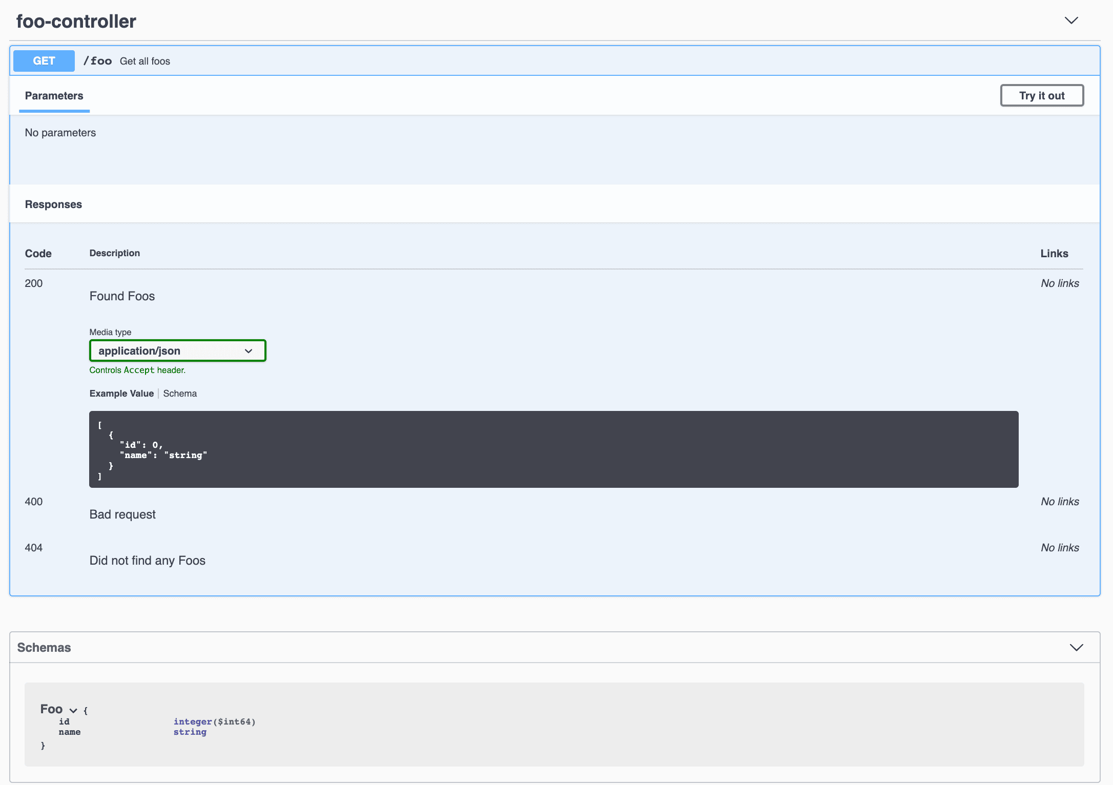 我們沒有獲取響應 400 和 404 的 Schema。 因為我們定義了空的 @Content 用於它們,所以只顯示它們的描述。