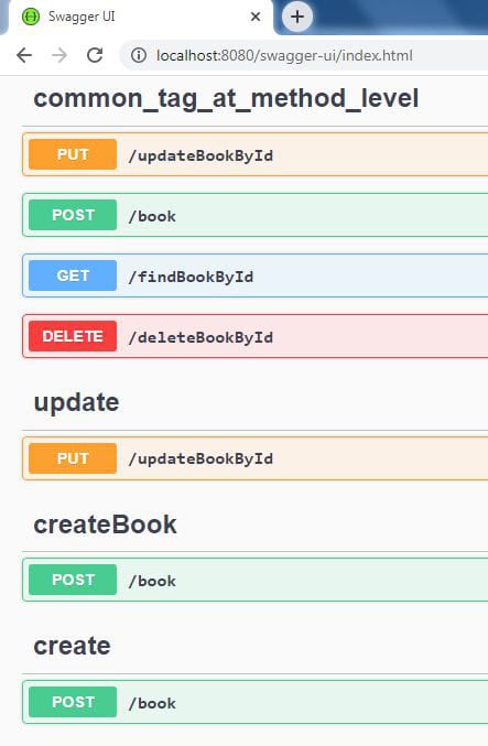 當運行應用程序時,Swagger UI (http://localhost:8080/swagger-ui.html) 會按照其默認顯示順序顯示標籤,並且某些附加條件會優先生效: