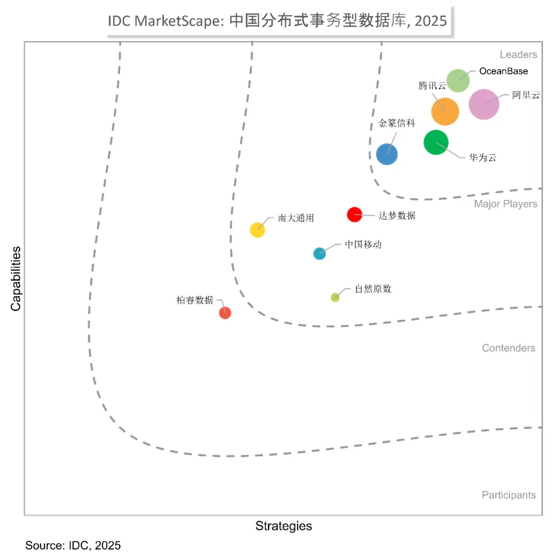 從全年表現來看,OceanBase 在分佈式事務數據庫賽道保持穩定領先。根據 IDC 最新發布的《中國分佈式事務型數據庫 2025 年廠商評估》,OceanBase 再次進入"領導者"象限,並在產品能力維度位列第一。這一結果顯示其在架構成熟度、工程化能力、高可用設計及大規模場景適配方面具備持續優勢。