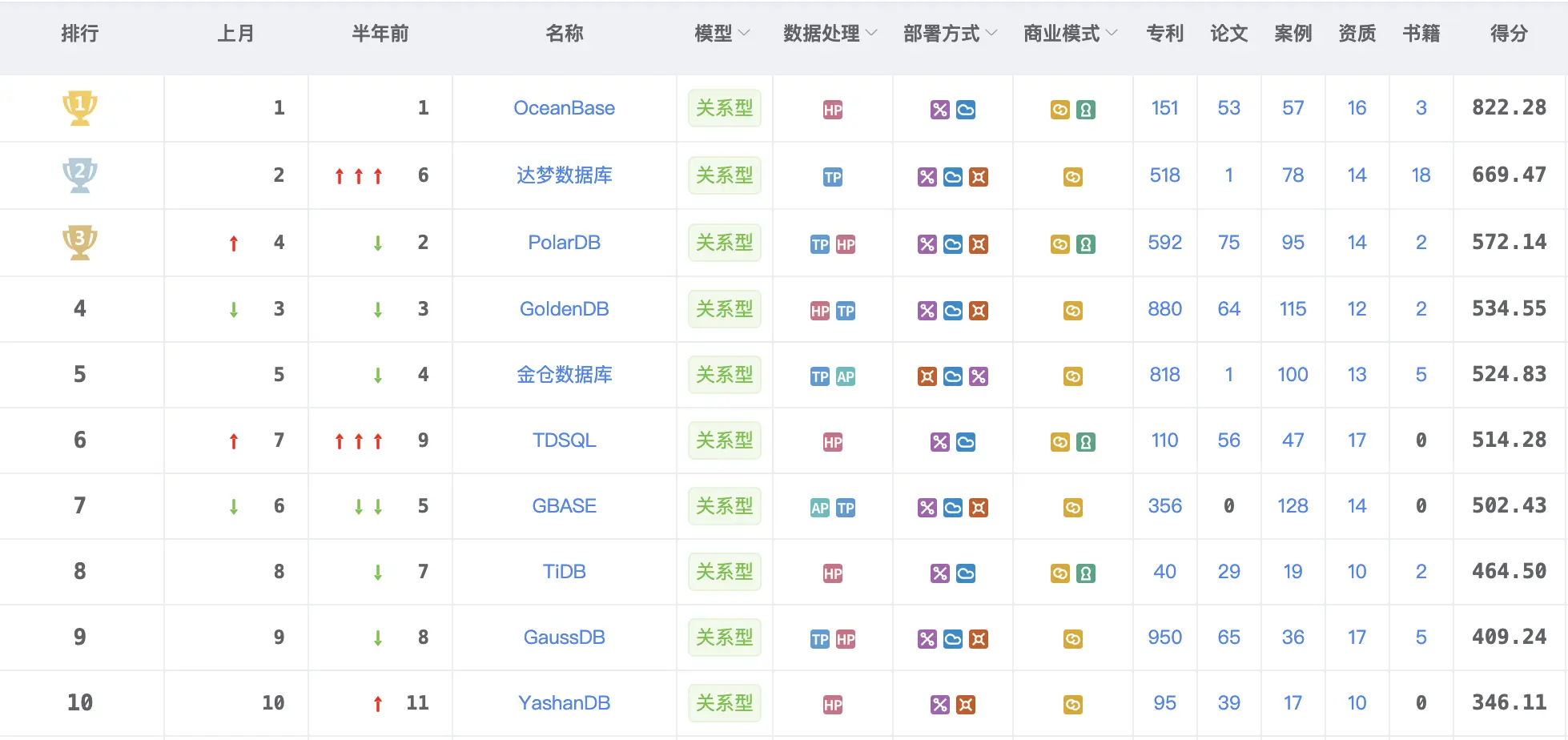 從排名結果來看,榜單榜首(狀元)依舊由OceanBase佔據。這並非 OceanBase 首次登頂,而是其已持續保持榜首位置逾一年。僅從得分維度分析,OceanBase 的分值大幅領先於第二名(榜眼),第二名若想在後續榜單中實現對其的超越,難度極大。