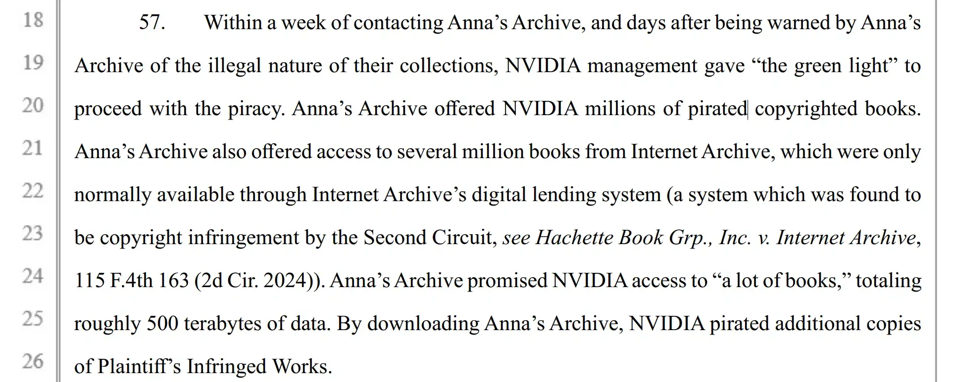 文件指出,Anna’s Archive 承諾向英偉達開放約 500 TB 的數據,其中包括數百萬本通常只能通過 Internet Archive 數字借閲系統訪問的圖書,而後者自身也正捲入與出版商之間的版權訴訟。起訴書未明確披露英偉達是否最終向 Anna’s Archive 支付費用,但同時指稱,英偉達還被控使用了 Books3 以外的其他盜版來源,例如 LibGen、Sci‑Hub 和 Z‑Library 等網站。