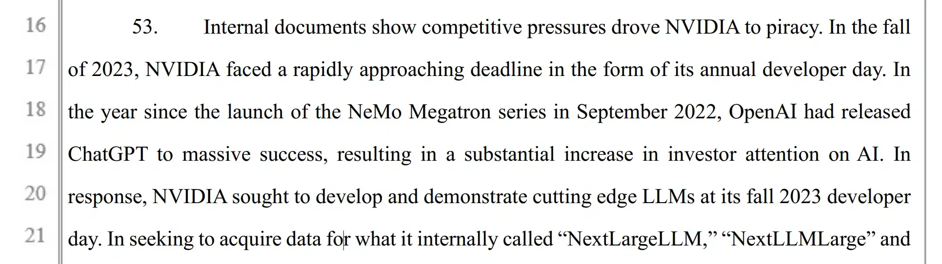 芯片巨頭英偉達(NVIDIA)在人工智能浪潮中成為最大受益者之一,其用於 AI 訓練的芯片和數據中心服務需求暴漲,同時還自行開發多種大模型,包括 NeMo、Retro‑48B、InstructRetro 和 Megatron,並依靠海量文本數據進行訓練。然而,這一過程也招致版權方日益激烈的法律反擊,多名作家指控該公司大規模使用盜版圖書訓練模型,並在美國提起集體訴訟。