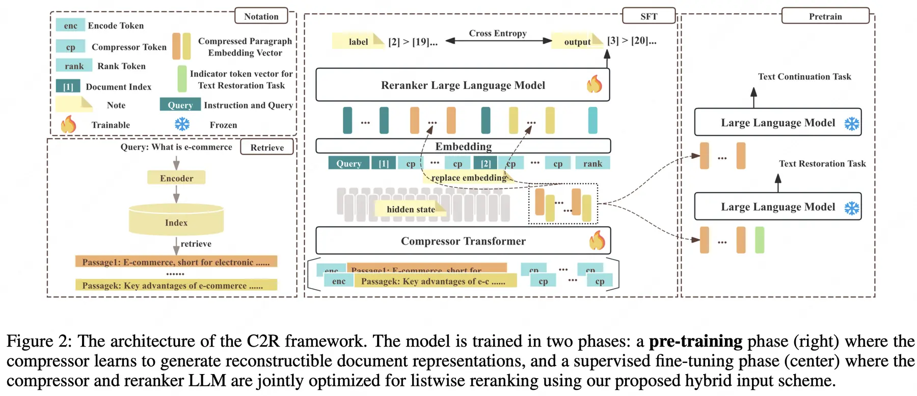 為了解決這些問題,我們提出了一種高效的框架壓縮後排序(Compress-then-Rank, C2R),該框架不是直接對原始段落進行列表重排序,而是對其緊湊的多向量代理進行操作。這些代理可以預先計算並緩存,適用於語料庫中的所有段落。C2R 的有效性依賴於三項關鍵創新。首先,壓縮模型通過結合文本恢復和文本延續目標進行預訓練,生成高保真的壓縮向量序列,從而減輕了單向量方法中常見的語義損失問題。其次,一種新穎的輸入方案將每個序數索引的嵌入添加到其對應的壓縮向量序列前,這不僅劃定了段落邊界,還引導重排序 LLM 生成排序列表。最後,壓縮模型和重排序模型通過聯合優化,使壓縮過程對排序目標具有排序感知能力。在主要重排序基準上的廣泛實驗表明,C2R 在提供顯著加速的同時,能夠實現與全文重排序方法相當甚至更優的排序性能。