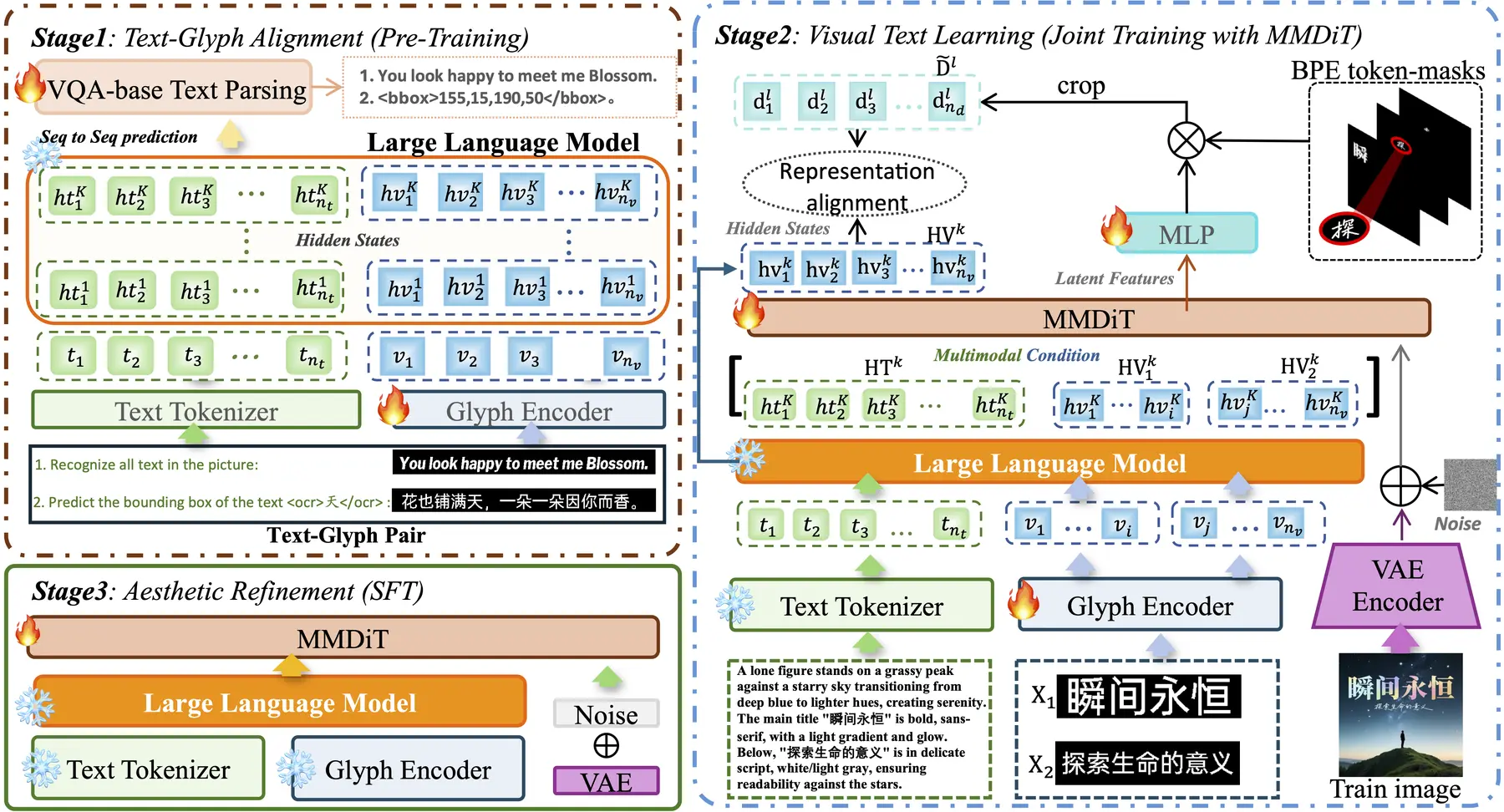 針對這一關鍵挑戰,我們提出ViType三階段對齊增強框架:首先通過視覺問答機制實現文本-字形顯式對齊,將字符視覺結構注入大語言模型語義空間;其次創新性地將預對齊字形嵌入與文本token同步輸入多模態擴散Transformer,通過聯合訓練建立跨模態特徵協同;最後基於高質量圖文對進行美學精調,確保生成圖像的版式和諧與視覺美感。該框架使字符準確率提升15%以上,為電商海報、營銷物料等高精度視覺內容創作提供了可靠的技術支撐。