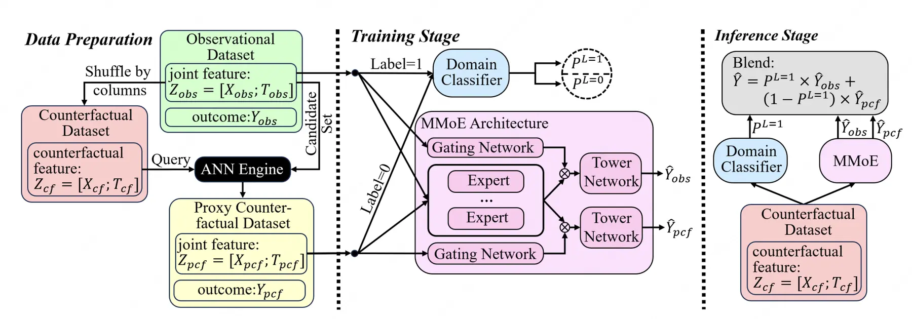 為此,本文提出雙源反事實融合模型(Dual-Source Counterfactual Fusion,DSCF),該可擴展框架通過雙專家混合架構聯合建模觀測數據和代理反事實樣本,並採用領域引導融合機制,在有效平衡偏差消除與信息多樣性的同時,還能自適應地泛化到反事實輸入場景。在合成和半合成數據集上的大量實驗表明,DSCF框架能夠顯著提升高維組合干預場景下的預測準確性,並在不同情境下展現出優異的魯棒性表現。