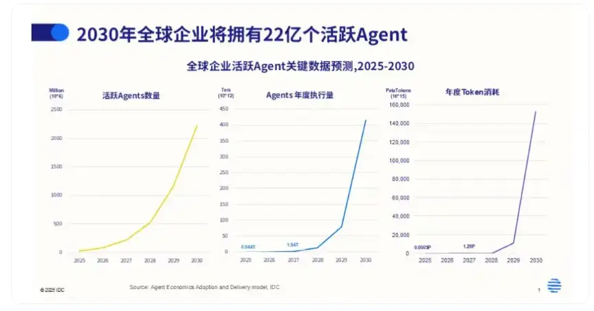 IDC預計,活躍Agent的數量將從2025年的約2860萬,快速攀升至2030年的22.16億。這意味着五年後,能夠幫助企業執行任務的數字勞動力數量將是今天的近80倍,年複合增長率139%,換言之,平均每年活躍Agent數量都將以超過一倍的速度增長。