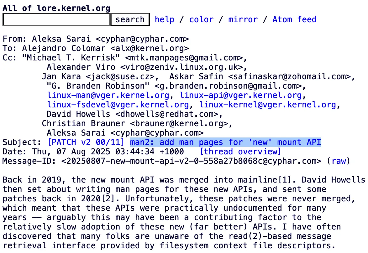 直到 2025 年 10 月,隨着 manpages 6.16 版本發佈,這些文檔才最終出現在 man 系統中,但在像 man7.org 這類在線手冊鏡像上的更新仍在等待同步。