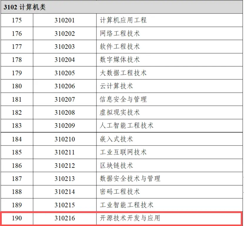 根據2025年12月教育部發布的《職業教育專業目錄增補清單》,在中職、高職專科和職業本科層次均新增了與開源相關的專業: