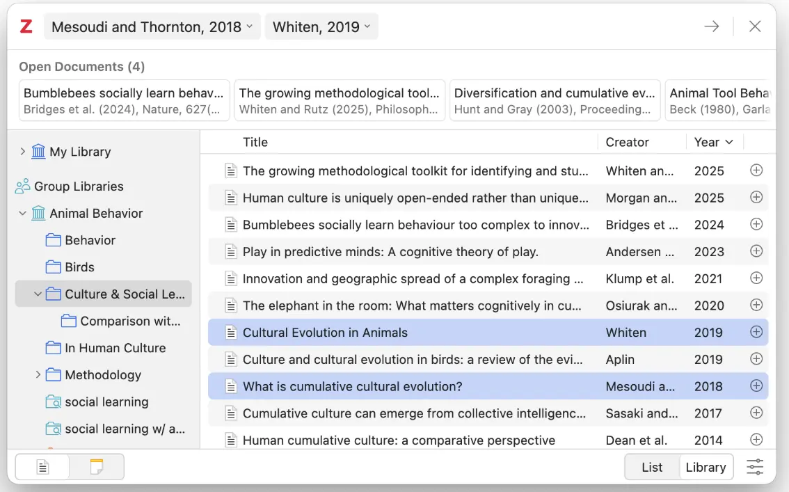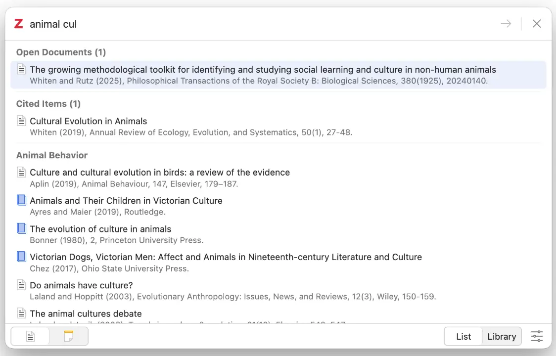 Zotero 7 中新增了快速為選定條目和已打開文檔添加引用的功能。在新對話框中,列表模式和文獻庫模式下均可使用這些選項。