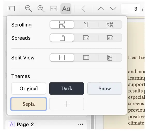 在閲讀器中添加了一個新的“外觀”面板,可以快速訪問視圖設置,並引入了對閲讀器主題的支持。