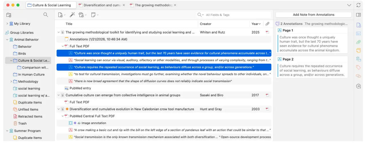 在項目列表中顯示註釋功能,便於跨圖書館或收藏集瀏覽註釋內容,同時支持直接搜索註釋。例如,可搜索某收藏集中帶有特定標籤的所有註釋,進而從這些註釋創建筆記,或通過快速複製功能將其導出至外部文本編輯器。