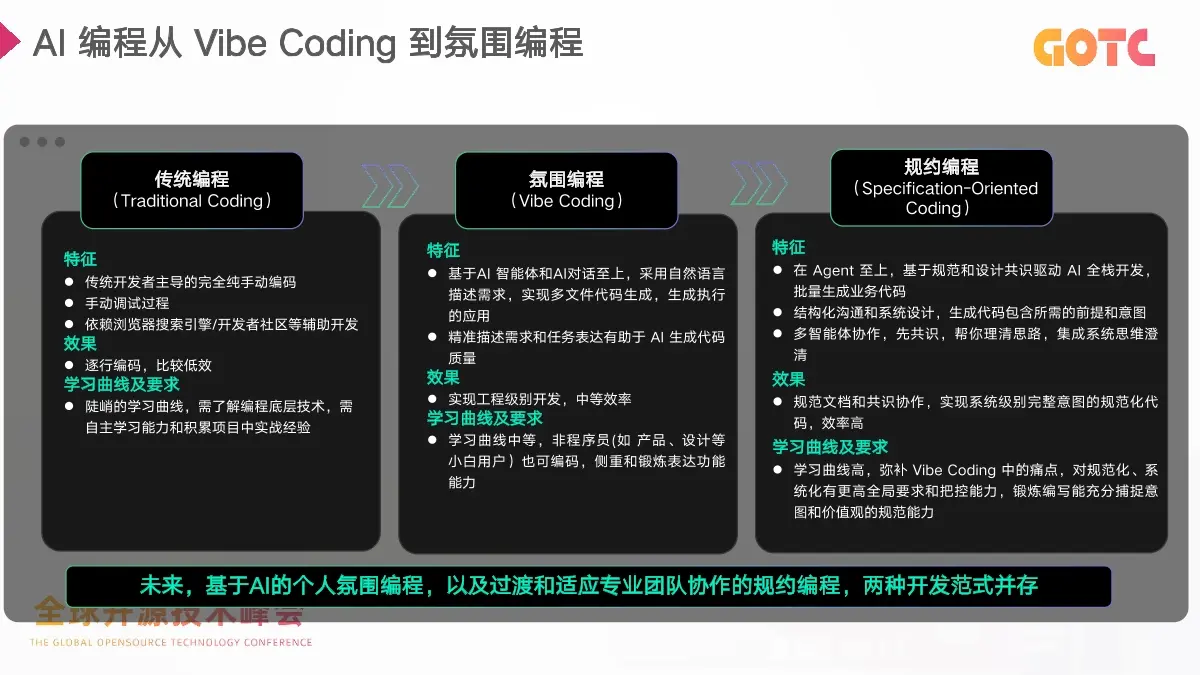 這場演講沒有推銷任何工具,它把兩年來從 SpecKit、OpenSpec 到 CodeBuddy 等開源實踐踩過的坑,抽象成三段可落地的範式升級:人機協作、上下文協作、規約協作。