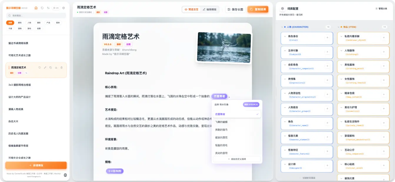 該工具的核心亮點在於其創新的交互方式。它將傳統需要記憶和準確書寫長文本的Prompt,拆解為“人物”、“動作”、“畫風”、“場景”等獨立變量。用户只需通過簡單的點選、拖拽和在預設分類中進行填空,即可直觀地構建出完整、格式規範的Prompt結構,系統會自動處理逗號分隔、權重標註等易錯細節。