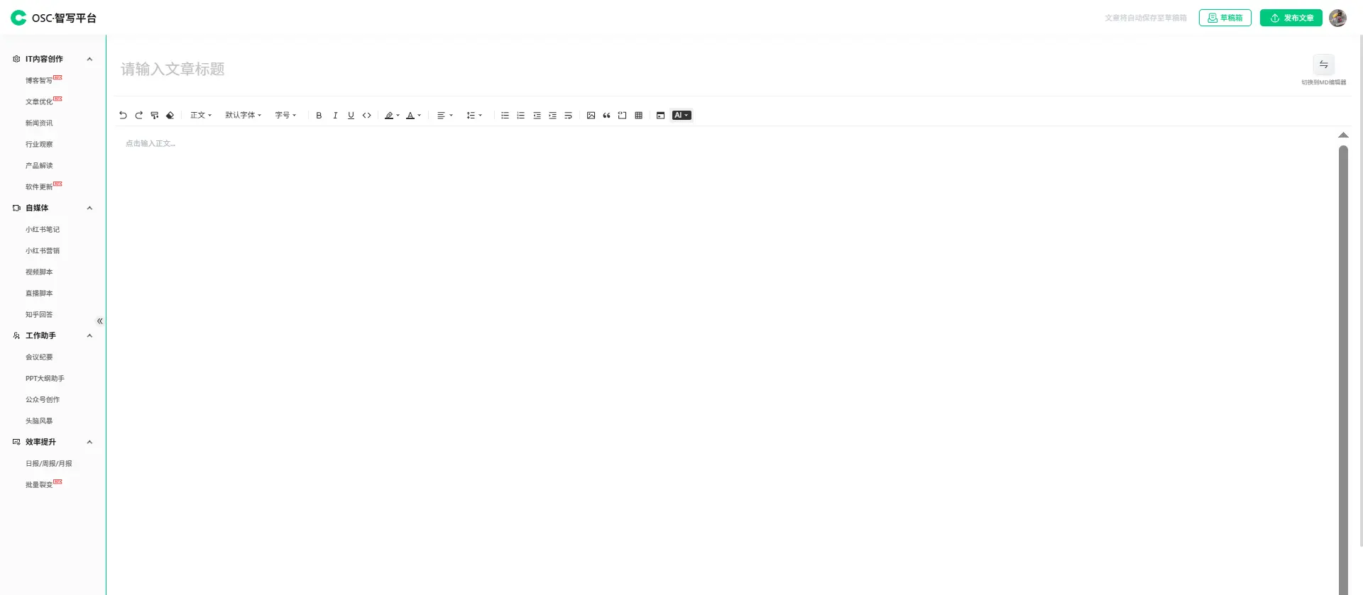 目前,智寫平台已深度集成 DeepSeek、Qwen 以及 GLM 等主流大模型,用户可根據創作需求或偏好在多個模型間靈活切換。平台界面設計簡潔直觀,操作流程簡單易用;同時支持 MD 編輯器與富文本編輯器的雙模式切換,滿足多樣化編輯習慣。