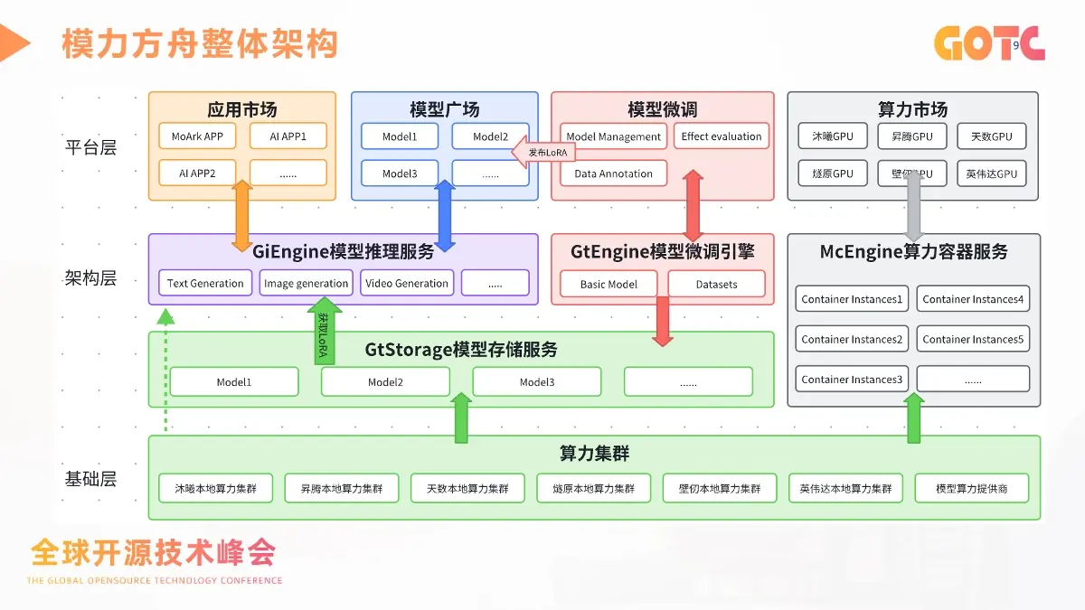 在此基礎上,模力方舟(Gitee AI)被設計為一個面向開發者、企業與終端場景的 AI 應用共創平台。它整合模型服務、Serverless 化能力、API 組合與應用生命週期管理,並依託 Gitee 既有 DevOps 能力實現從開發到上線的協同支持。平台的整體能力劃分為四大部分:AI 模型廣場、模型定製、AI 開發者教育與 AI 應用共創。