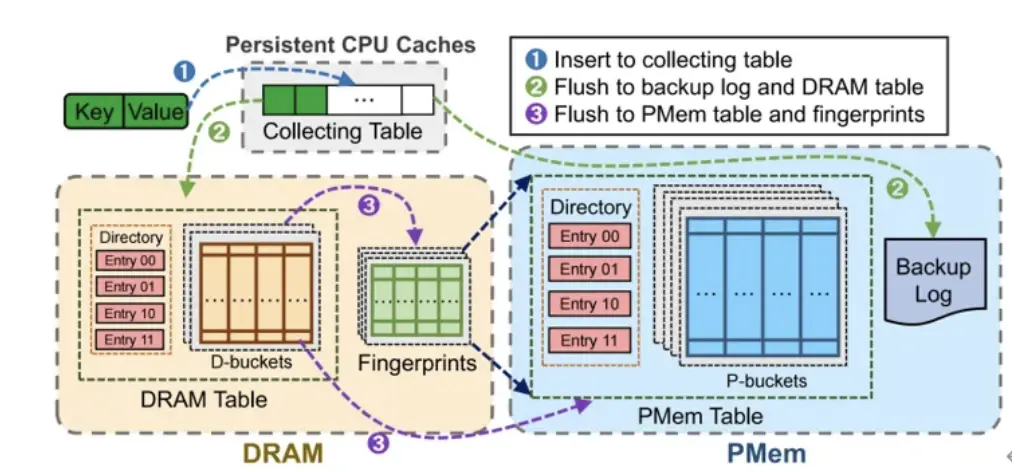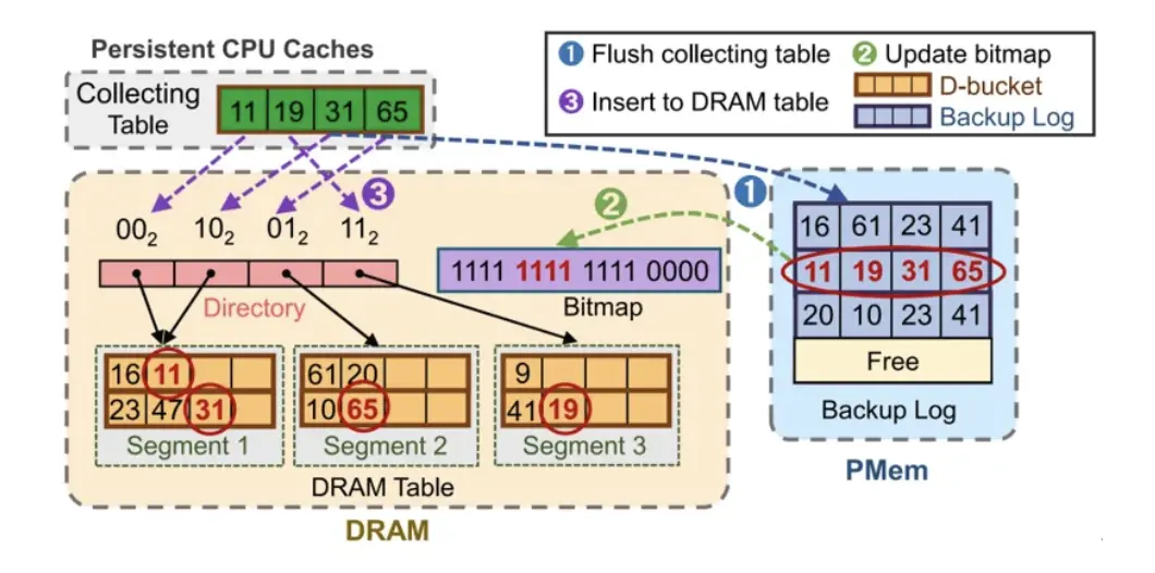 此技術旨在根治向 PMem 進行小粒度插入時引發的“寫放大”(Write Amplification)與頻繁桶探測問題。其方案是在持久性 CPU 緩存中預分配多個與 PMem 訪問粒度對齊的“收集表”(Collecting Table)。新到達的鍵值對根據哈希值被直接路由到相應收集表,並通過原子操作實現無鎖快速插入,從而充分利用緩存的高速與持久化特性。當一個收集表被填滿時,其包含的多個鍵值對將作為一個完整的、與 PMem 最佳寫入粒度匹配的數據單元,被一次性順序刷寫到 PMem 的備份日誌中。這種方法徹底消除了因寫入粒度不匹配帶來的額外 I/O 流量,充分利用 PMem 的寫入帶寬,同時將零散插入轉化為高效批量操作。