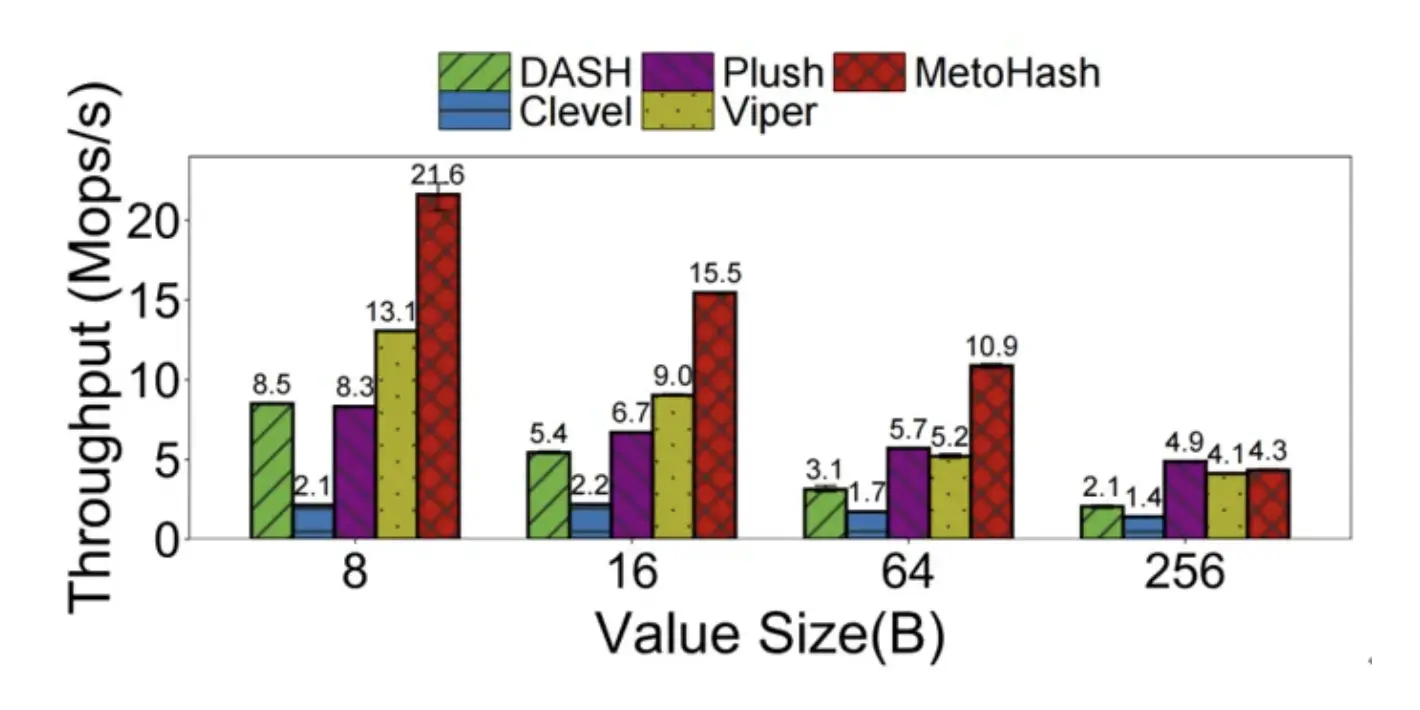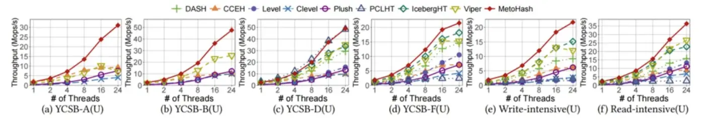 在實際搭載英特爾傲騰持久內存的測試平台上,MetoHash 與八種前沿方案進行了全面對比。
